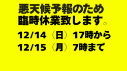 今晩もひどい天候なので、本日17時~明日の朝、12/15日(月)朝7時まで一時休店します。