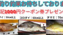 お知らせ フエダイ(シブダイ)50cm、コロダイ60cm、ハマフエフキ(タマン)70cm、お待ちしております。