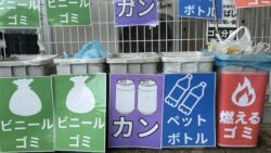 お知らせ ゴミの分別にご協力ください。カン、ビン、ペットボトル、燃えるゴミ、に分けられています。