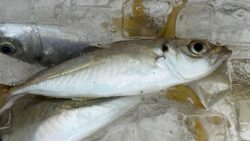 波止釣り・サーフ釣り釣果 5月23日木曜日のサビキ釣果。マルアジ、ウルメイワシが多く、これにマイワシが混ざる。