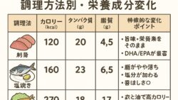 魚のアレコレ 【20cmのマアジ】調理方法別・栄養成分変化一覧表(可食部100gあたり)