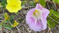 お知らせ ビーチに咲くピンク色の花はグンバイヒルガオ(軍配昼顔)。黄色はマツバウンラン(松葉海蘭)。