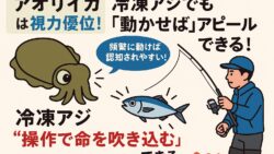 アオリイカ生態、釣り情報関連 アオリイカは視力が秀でているため、冷凍アジは小刻みに動かせばアピールできる。