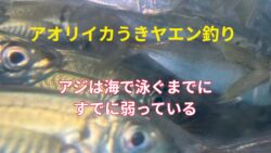 アオリイカ生態、釣り情報関連 アオリイカのヤエン釣りに使うエサの活けアジ。アジですくう、バケツの中で詰められ揺られる、ゼイゴに針を刺される、投げられる。これらの負担率はどの程度?