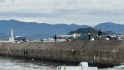 お知らせ もうすぐカマス、太刀魚釣りで場所取りが苦労するほど込み合う和歌山田辺市芳養(はや)堤防。