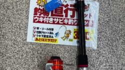 釣具、エサ紹介 リールにPEラインを巻き、リーダーを付けています。手軽ルアーフィッシング用品。
