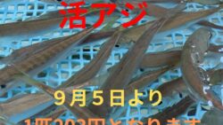 お知らせ 活アジ203円、9月5日より価格改正いたします。