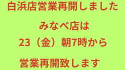 お知らせ 白浜店営業再開しました。みなべ店は23(金)午前7時からとなります。