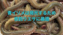 釣具、エサ紹介 夜釣りエサに人気が高い青イソメ。夜間に発光するため、視覚で魚を誘います。