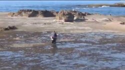 お知らせ 磯の上を自転車やバイクで移動する、地元の釣り人たち。