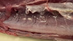 釣り考察 寄生虫のカツオ虫ことテンタクラリア。 鮮度がいい生カツオに見られ、冷凍物は死滅して透明になります。