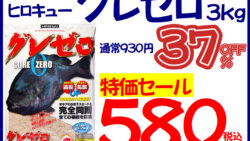 お知らせ ヒロキュー集魚剤グレゼロ37%off。いつもより350円お得。580円で特売中。