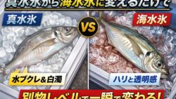 釣り考察 潮氷(氷+海水)は魚冷却に最適だが、これは通常真水氷だが、海水氷に変えた場合、どのように変化があるか?
