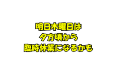 お知らせ 明日木曜日は、夕方ごろより臨時休業になるかもしれません