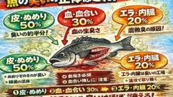 未分類 魚の臭いの正体は、 皮・ぬめり50%、血・血合い30%、エラ・内臓20%。